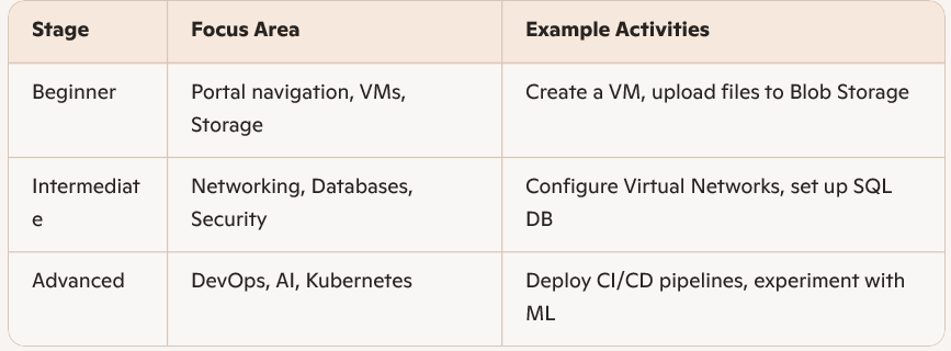Use the Azure Sandbox or free tier to experiment with creating VMs, deploying web apps, and setting up databases.